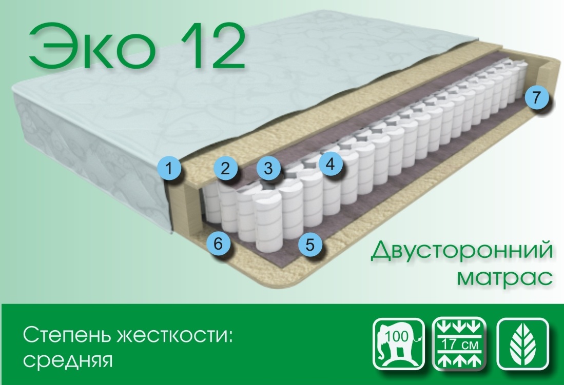 Эко 12 - средняя жесткость. Это матрас является самым простым и долговечным. Обеспечивает поддержку позвоночника и абсолютно Гипоаллеренный.
